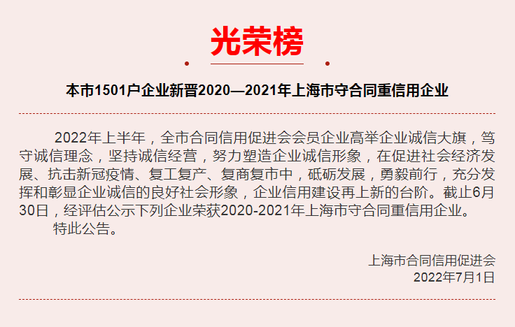 恭賀永青榮登2020-2021年度上海市守合同重信用信息企業(yè)光榮榜